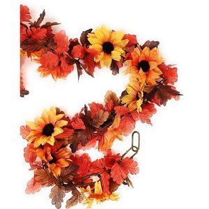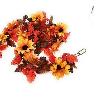 Festive fall garland with sunflowers nestled amongst rich autumn colors of brown and orange. This festive garland showcases a flexible plastic chain base adorned with a delightful assortment of yellow sunflowers and decor. Hang it effortlessly on any surface, be it a wall, mantel, banister, or beyond, using the convenient loops provided at each end