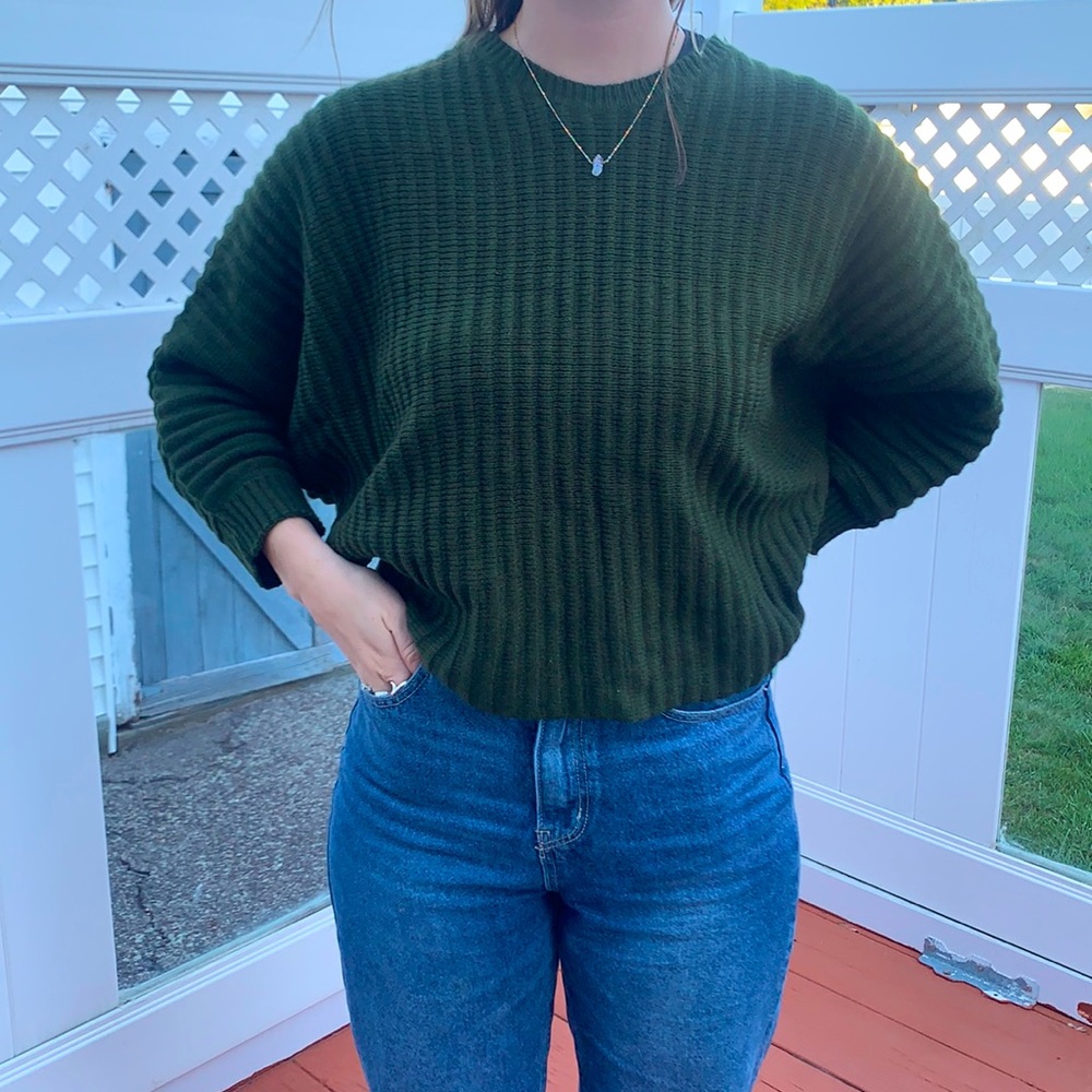 Forest green sweater with 3/4 length sleeves & slight cropped