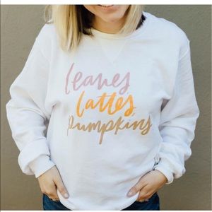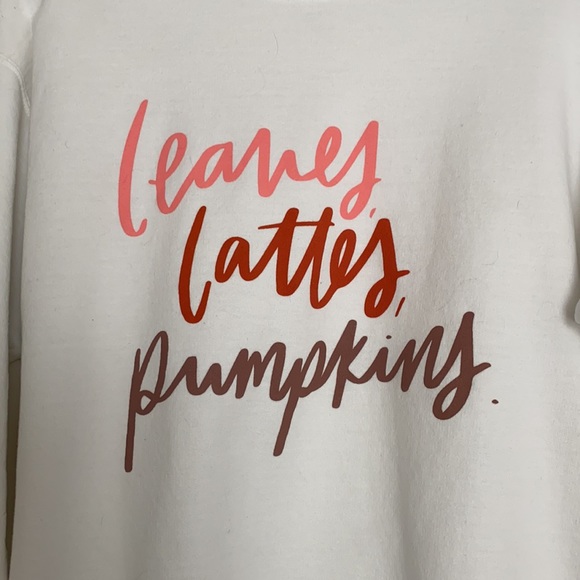 By Rachel Allene, white sweatshirt, size medium with “leaves, lattes, pumpkins.” text. Worn once.