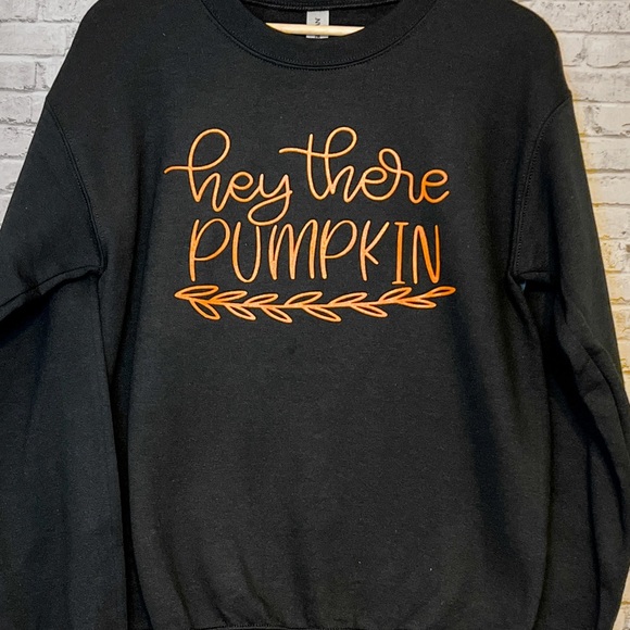 Black unisex fit sweatshirt with orange writing that would look so good traveling to the pumpkin patch or other fun Fall activities. Fit is true to your normal size.