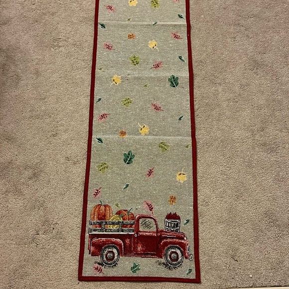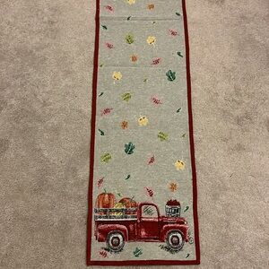 Gently used. No stains or tears. Fall themed table runner with red truck filled with pumpkins on each end and fall colored leaves down the center. Grey/creamed colored background with red trim. Measures 13in x 68in. Comes from a pet free, smoke free home. I'm willing to offer discounts on bundles, so make me an offer.
