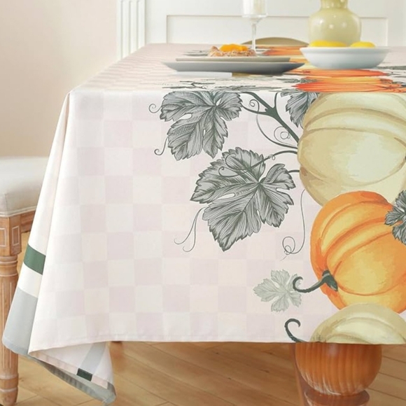 Beautiful fall tablecloth with pumpkin & leaf print. Features orange and cream colors as well as a checked pattern. By Laolitou, 60" x 70". See photos for more details. New, never used.
