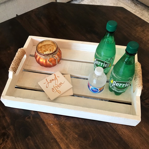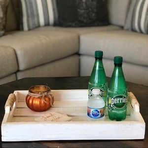 -a distress white wooden tray with rope detailing. Tray measures 18in X12in. With its simple minimalist design use if for Fall and year round with other decor items.