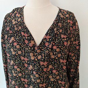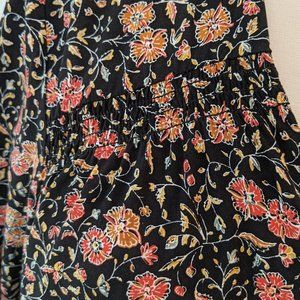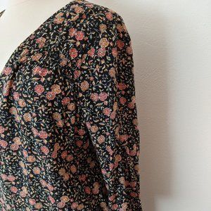 Loose and comfy for three seasons!. A floral shift dress made with a more substantial rayon so it doesn't cling at all. 3/4 length sleeves, zip back and no pockets. Colors: Black background with coral and tan flowers. It looks great with black tights or leggings! Generous fit! No flaws and in very good condition.