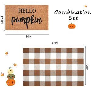 Fall Welcome Mat Set: Coco Coir Mat & 28x43 Coffee/White Plaid Rug -Autumn Decor