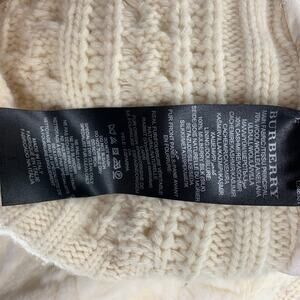 BURBERRY PRORSUM Fall Winter 2011 pullover sweater comes in a cream cable knit wool / cashmere and rabbit fur materials, featuring a V-neck, raglan sleeves, a cable knit fur panel at front, a mulberry silk lining, and ribbed cuffs and hem. With original Burberry Dustbag. Made in Italy.