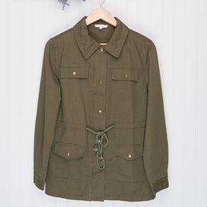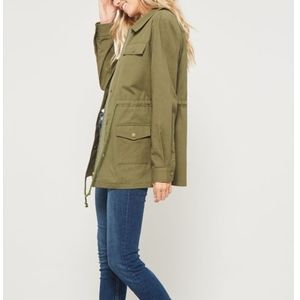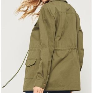 Description: A solid woven jacket featuring dual front zip and snap button closure, basic collar, long sleeves with snap-button cuffs, front snap button flap pockets, and drawstring waist design. This jacket is made with a medium weight fabric that is very soft