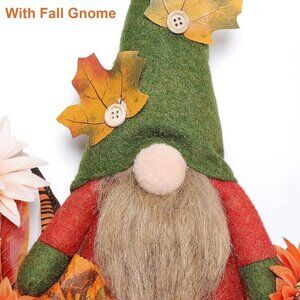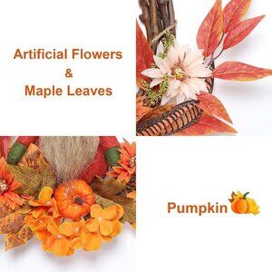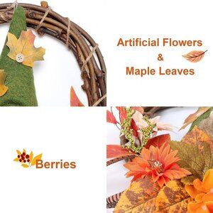HANDMADE WREATH - Features lucky stuffed fall gnome, this wreath is extremely eye-catching. Crafted with autumn ornaments in vibrant colors. Artificial flowers, maple leaves, berries, and pumpkin add strong festive touch during fall harvest festival.