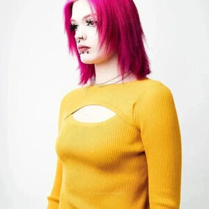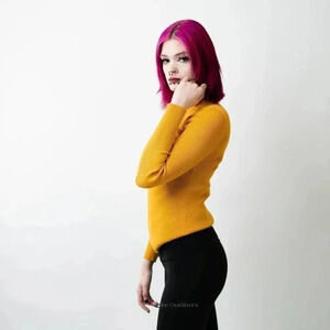 Fall Yellow Ribbed Long Sleeve Smocked Crewneck Sweater - L