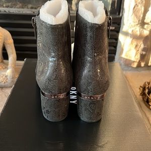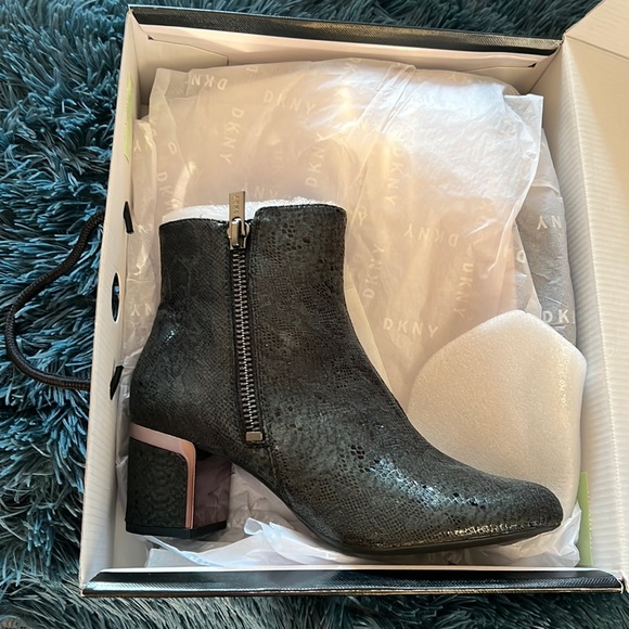 This is a well made ankle boot by DKNY. Brand new still in the box. Never had the chance to wear them. Size 8 1/2. Hunter green faux python look. If you have ever worn a boot from this brand then you already know.