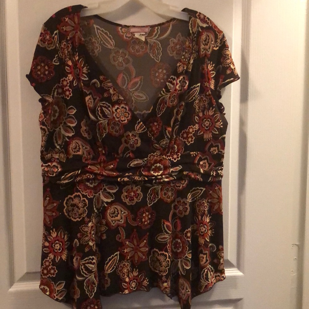 Flowered pattered blouse in beautiful fall colors! Short sleeves.