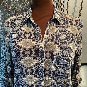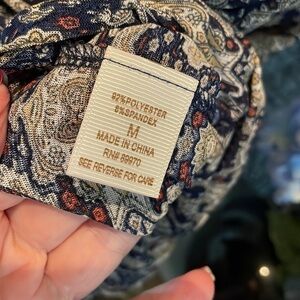Navy,tan and rust combined in a beautiful fall print 🍁 ! Lightweight stretchy fabric for a fall look even when it’s still 🥵!