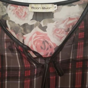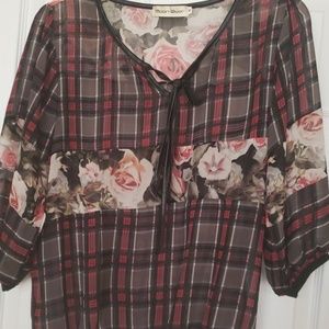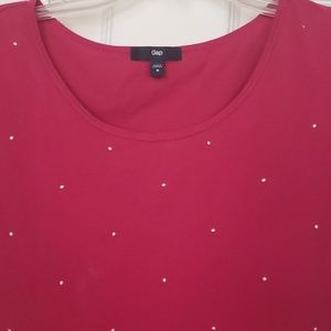 First top is a very feminine blouse in red and fall green stripes with floral print across chest and arms it's very pretty paired with denim or black leggings and your favorite boots. Second top is a raspberry wine color with gold embellishments size medium from the Gap.