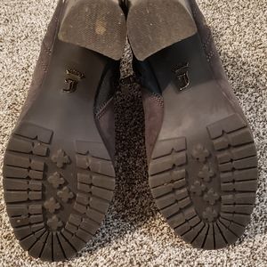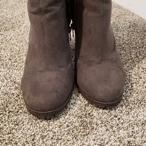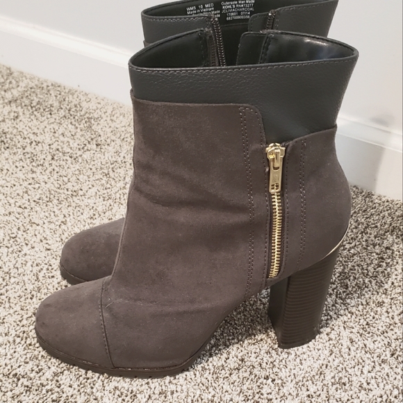 Cutest fall boots! Gray suede material with faux leather on top and gold zipper accents. Excellent used condition!
