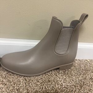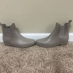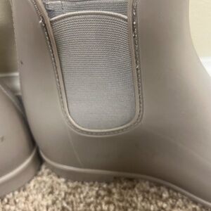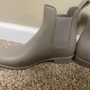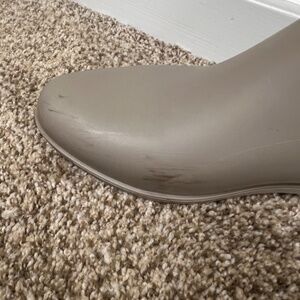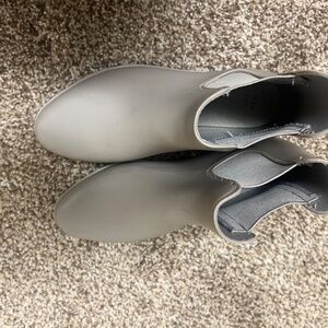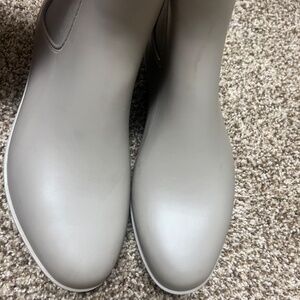 Lightly worn new day boots, fall boots, rain boots super cute worn once. Size 8 woman’s grey taupe color. Worn once has minor little flaws as per photos. But practically in mint condition