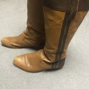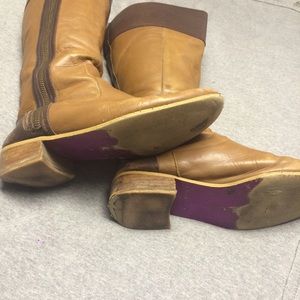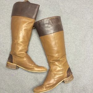 Twiggy London riding boots size 8. Upper is leather, lighter brown is man-made. Still in great condition, some signs of wear. Thanks for looking!