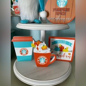 Gorgeous Fall decor set. You will receive the five items pictured. The gnome is absolutely adorable with his little drink lol. Pairs well with tier trays and rae dunn. Place them all together or mix and match throughout your home or office.