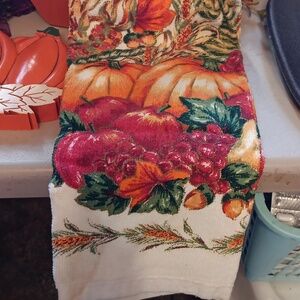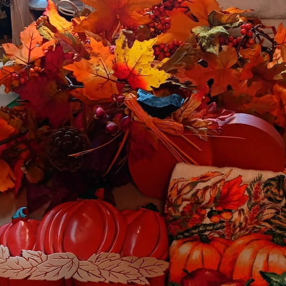 Hand towel, resin pumpkin, and wooden pumpkin, a bundle of fall leaves