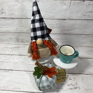 Gnome, fabric pumpkin, tiny ceramic cup.