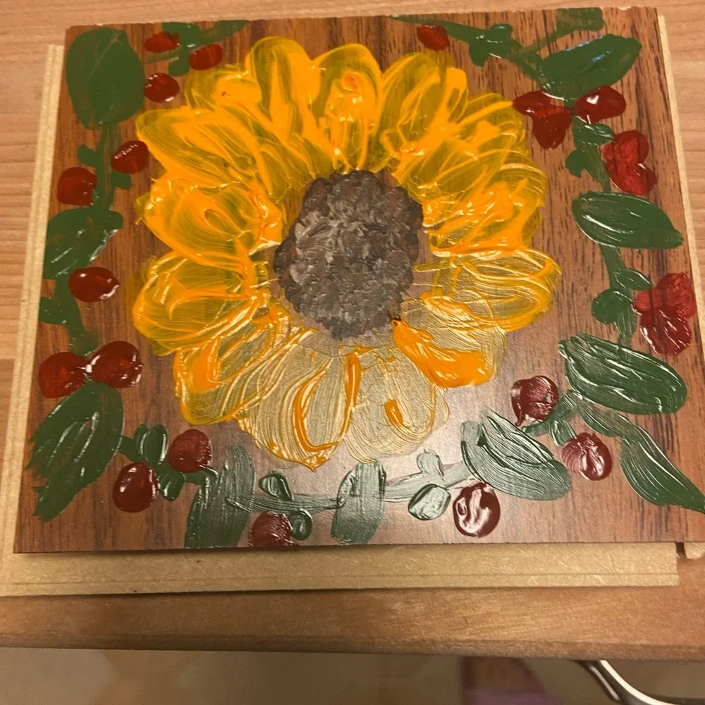 Sunflower painted on floor tile . Fall decorations or knickknacks . Also has some Christmas colors in there too. Handmade by me . Thanks for looking