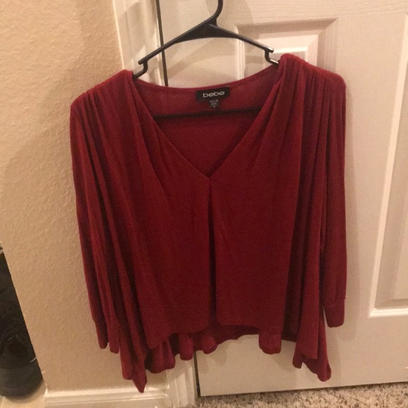 Beautiful deep red Bebe blouse. Perfect for a chill evening out, business casual, and brunch! Uneven hemline creates a nice silhouette. Worn once.