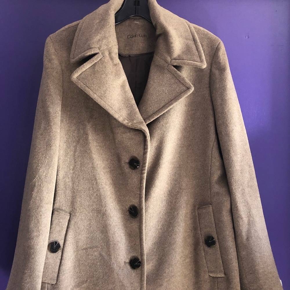 Calvin Klein camel-colored wool, nylon, silk blend. 100% polyester lining. Three button front and kick-pleat in the back. Size 14; never worn.
