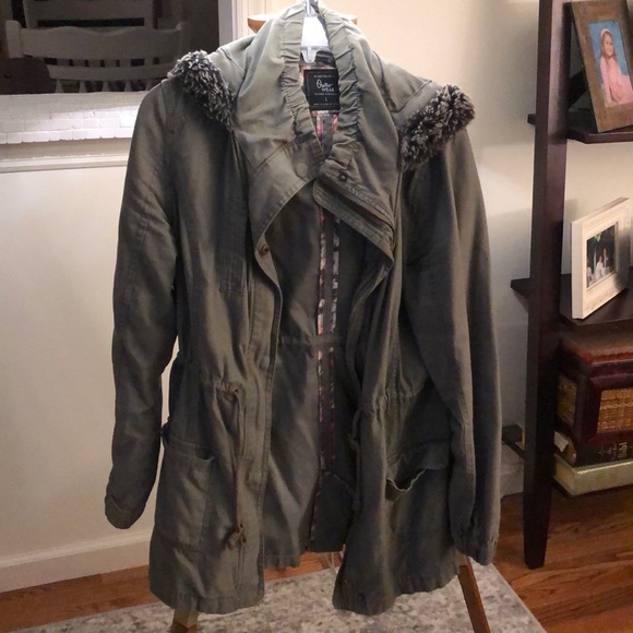 Army green lightweight cargo jacket drawstring waist hooded zipper and snaps closure