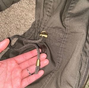Has a detachable hood an adjustable strings on the waist of the jacket to make it fit tighter or loose