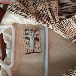 Maurice's hooded jacket, sweatshirt like material. Size small. Tan with brown/maroon detail. Good condition, just missing three waist tie. Does not have pockets.
