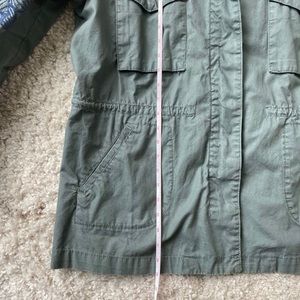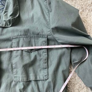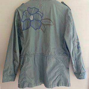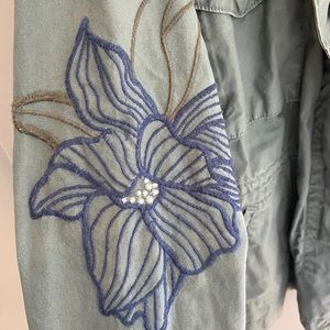Has cute flower embroidery. Olive/army green. Great weight for fall. String to cinch at waist is missing. Some minor threads sticking out but otherwise no flaws that I noticed on it.