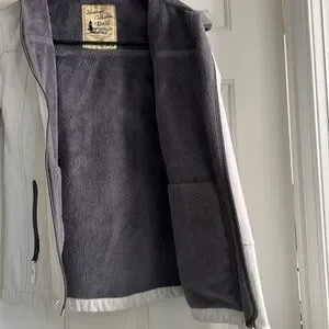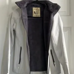 Worn only once. White with grey fleece lining. Side zip pockets and two internal pockets. Detachable hood. Excellent condition.