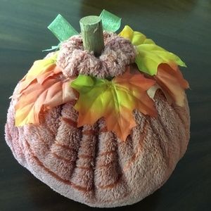 Handmade new fall pumpkin. 8x6” velour stripe fabric. Wood stem, fall leaves and green organize ribbon.