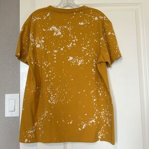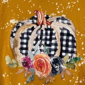 Fall pumpkin tee. Mustard tee w bleach splatter. Buffalo check pumpkin with floral design. Tee is lucky friends. Size L.