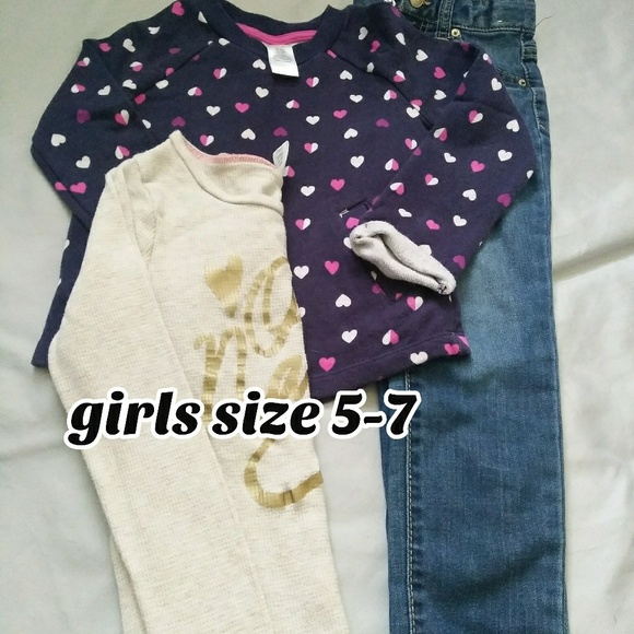 Sweatshirt is Gymboree size 5/6 not sure why it looks purple in 1 pic but it's not a little faded top is old navy jeans are cat and Jack skinny size 5