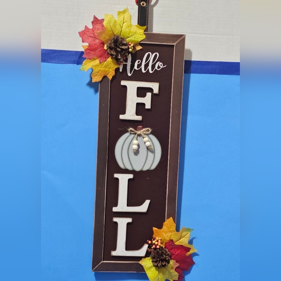 Add some autumn charm to your home with this beautiful hanging sign. Crafted from wood, this medium-sized sign measures 21.25 inches in length and 10 inches in width. The brown color and seasonal theme make it a perfect addition to your fall decor collection.