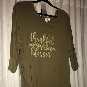 Slouchy fit, glam casual. Small rouching on the side, elastic band near the hem for a tailored look. Great fall or thanksgiving top! Fits more like a 1X