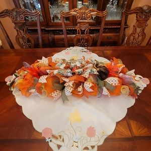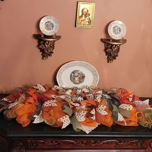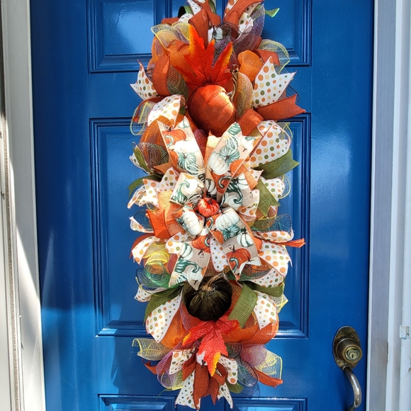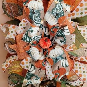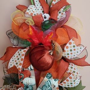 this beautiful fall swag is made with quality deco mesh. decorated with ribbon and velvet pumpkins. in the center is a big bow made with different colors of ribbons.