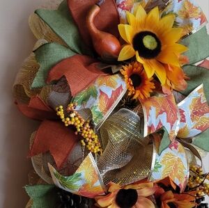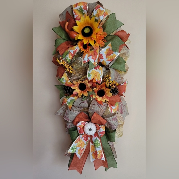 This beautiful handmade fall swag is made with quality deco mesh. Decorated with ribbon and silk sunflowers.