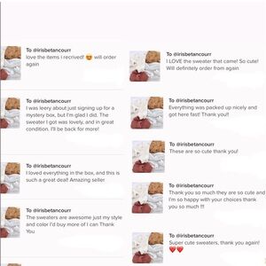 •The mystery box will include 2-3 NWT or gently used sweaters/cardigans perfect for a comfy fall look! This box will include a huge variety of brands (ex: American eagle, Hollister, Universal Thread, Free People, Vintage, and many more!)