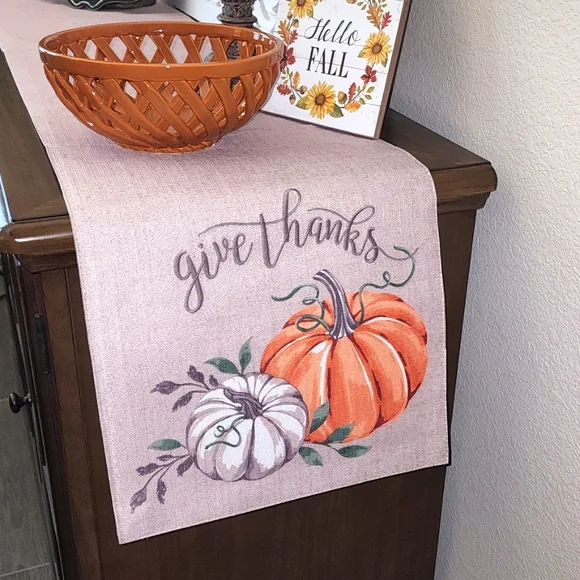 Beautiful fall pumpkins "Give Thanks" table runner. Dress up your tables or Buffet. Runner only, other items for props not included. Smoke free home.
