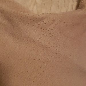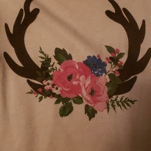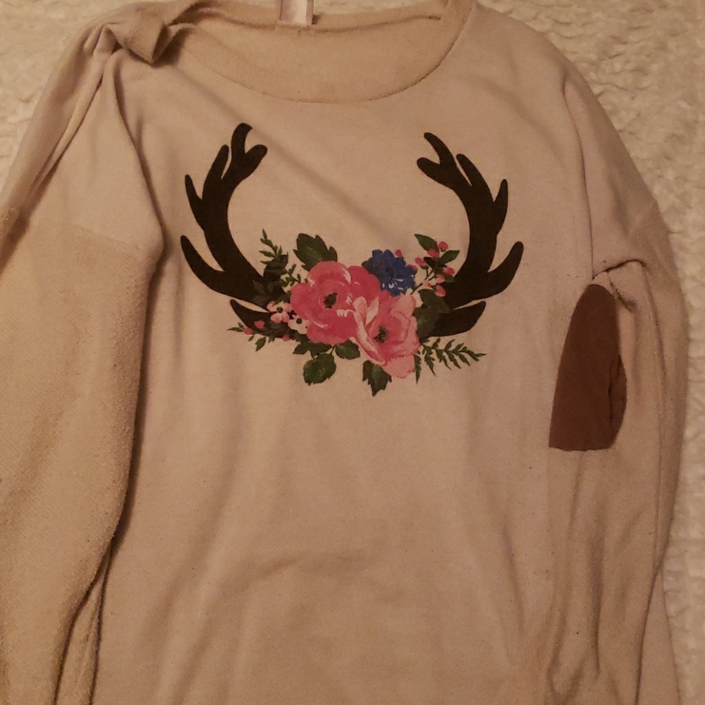 Off white fall tunic with antlers and flowers. It also has brown swade patches on the elbow. Long enough to wear with tights. Some pealing as shown on the third pic.