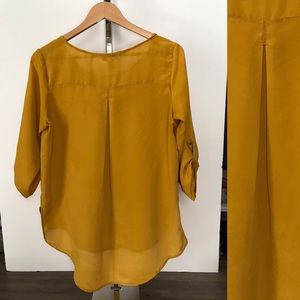 Beautiful mustard yellow top with three-quarter length sleeves. Perfect with leggings and boots.