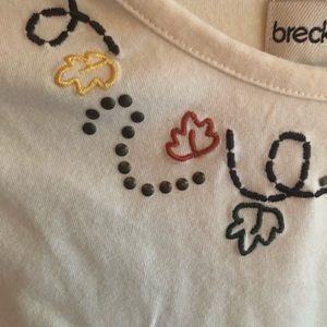 Cute fall top! Short sleeves with fall colored leaves across the neckline and stud accents. No holes or tears and is in good condition. Would be cute with bell bottoms or a suede skirt!