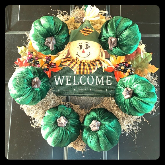 Green pumpkins and green welcome sign with scare crow fall wreath