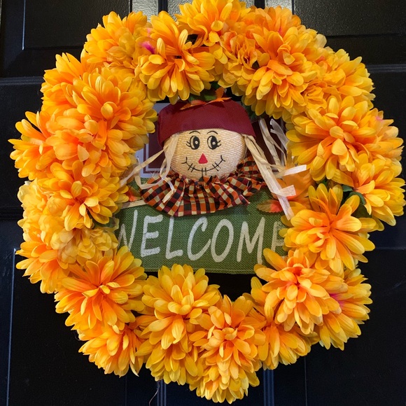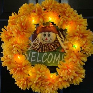Yellow flowers wreath with scare crow welcome sign. Has lights and easy battery change. Batteries included
