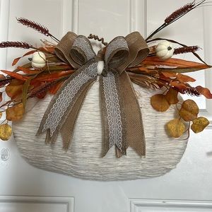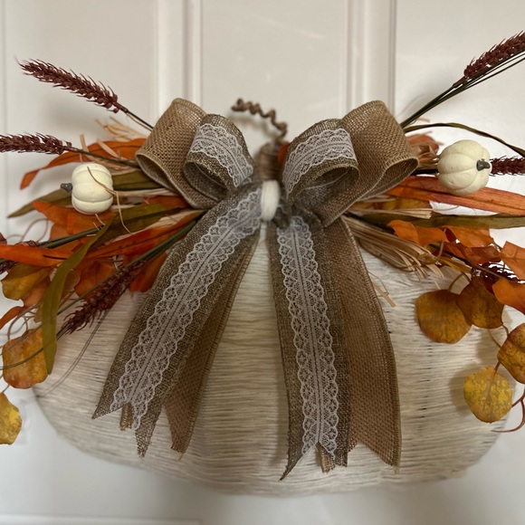 Super cute fall wreath waiting to be hung on your door or even a window. Great for up coming fall festivities! Hand weaved creamy white yarn with fall leaves and white pumpkins.