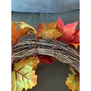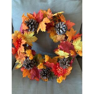 Leaves, pine cones, flowers adorn this 15” x 15” decorative wreath.