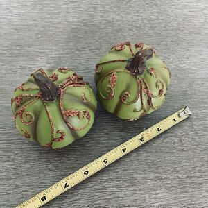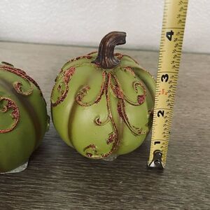 NWT set of 2 green pumpkins with brown glittery swirl accents. Resin-like material.