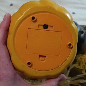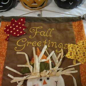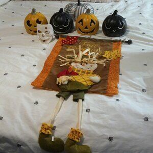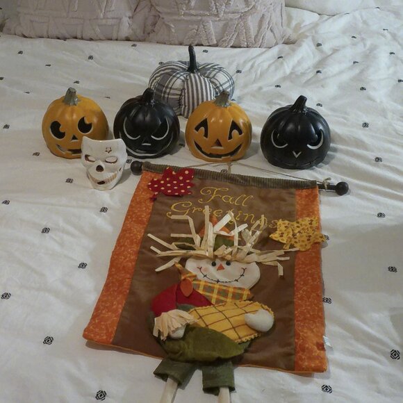 All gently used, 4 plastic light up pumpkins that require batteries (not included), fabric hanging fall greetings, black and white fabric pumpkin, skull candle holder.