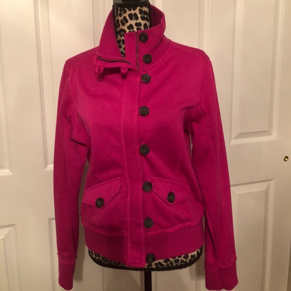 Cotton/polyester Fall/Spring jacket. Zipper and button front. Long sleeves. Comfortable and warm. I love this color. If you don’t buy this it will stay in my closet! 🙂💕🎀. XL but fits like a medium.